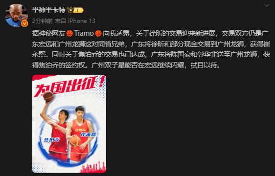 开云App-广东男篮送出陈国豪等四人+大量现金,换回崔永熙+焦泊乔 byxiaoqiao 发表于2025年09月05日 雷速体育8月28日讯 今日,据国内体育媒体人@半神半卡特爆料:广东男篮送出陈国豪等四人+大量现金,换回崔永熙+焦泊乔。具体内容如下:“关于徐昕的交易迎来新进展,交易双方仍是广东宏远和广州龙狮这对同省兄弟,广东将徐昕和部分现金交易到广州龙狮,获得崔永熙。同时关于焦泊乔的交易也已达成,广东将陈国豪和彰华非送至广州龙狮,获得焦泊乔的签约权。广州双子星能否在宏远继续闪耀,拭目以待。 ” 你可能感兴趣的内容 上一篇文章 开云官网-ESPN:贝蒂斯决定在财务方面做出努力,正在推进签约安东尼的谈判 发表于2025年09月02日 byxiaoqiao 查看文章 下一篇文章 开云App-库班:至少拥有15%的股份你才能有球队运营权 我还有27%的股份 发表于2025年09月05日 byxiaoqiao 查看文章 你可能会喜欢