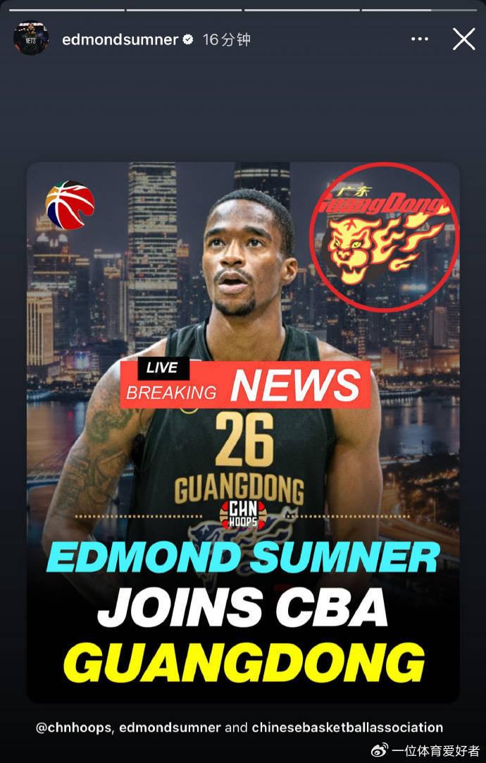 第二个消息,埃德蒙·萨姆纳自己宣布加盟广东宏远,自己转发了这条动态。
